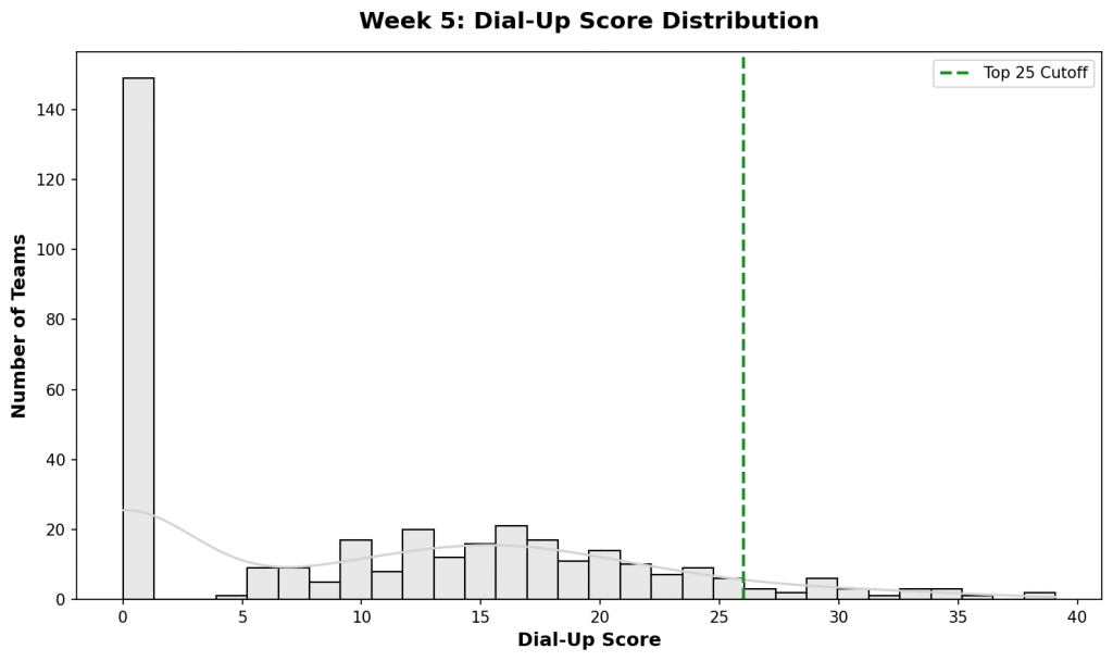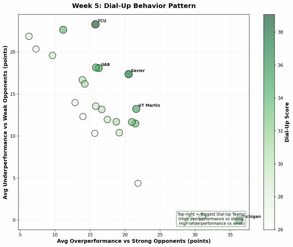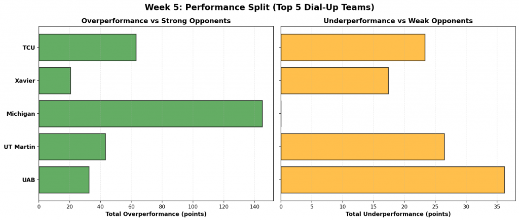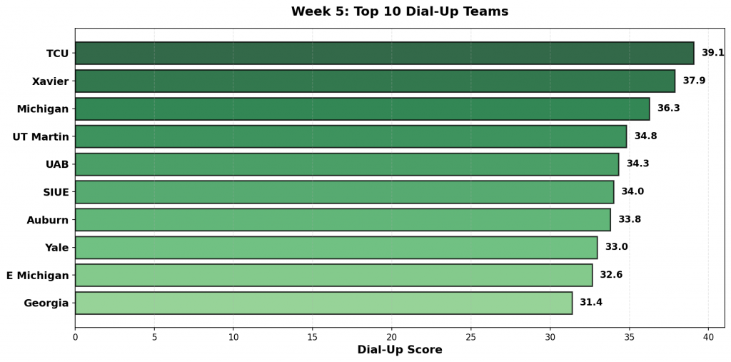 Figure 1: Top 10 teams with the highest Dial-Up scores in Week 5. Scores reflect the combination of overperformance against strong opponents and underperformance against weak ones.