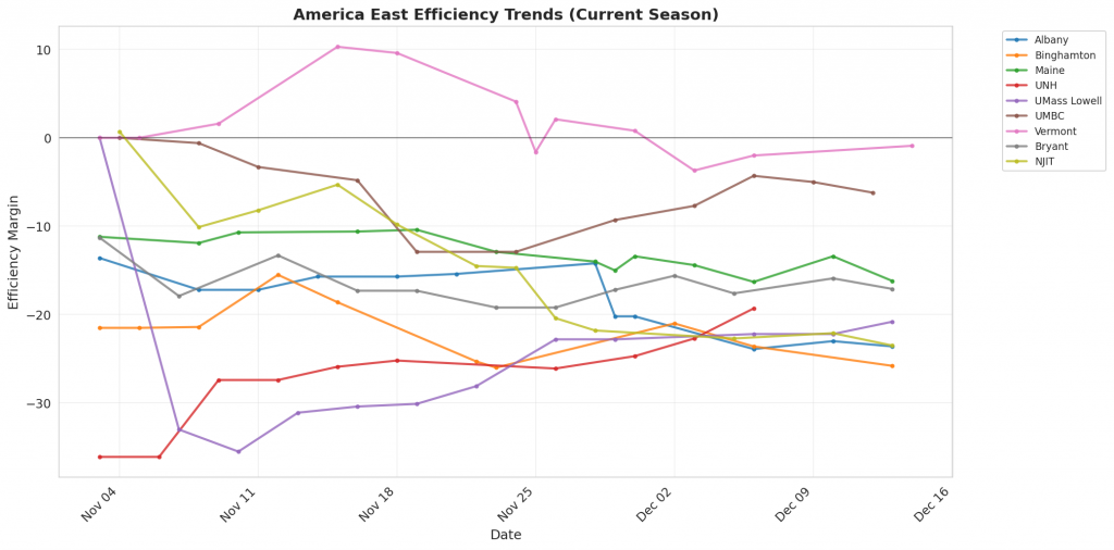 Figure 1: Efficiency margin trends for America East teams throughout the season. Teams trending upward show improving performance, while downward trends indicate struggles.