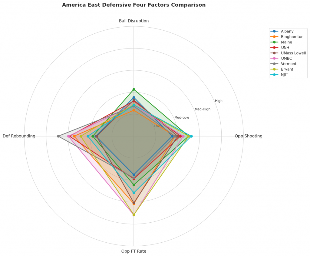 Figure 3: Defensive Four Factors comparison across America East teams. The radar chart shows each team’s opponent shooting defense (Opp eFG%), ball disruption (forcing TOV%), defensive rebounding (DREB%), and opponent free throw prevention (Opp FT Rate).