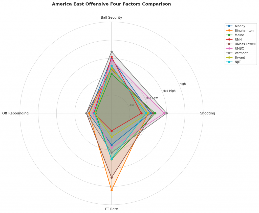 Figure 2: Offensive Four Factors comparison across America East teams. The radar chart shows each team’s shooting efficiency (eFG%), ball security (TOV%), offensive rebounding (OREB%), and free throw generation (FT Rate).