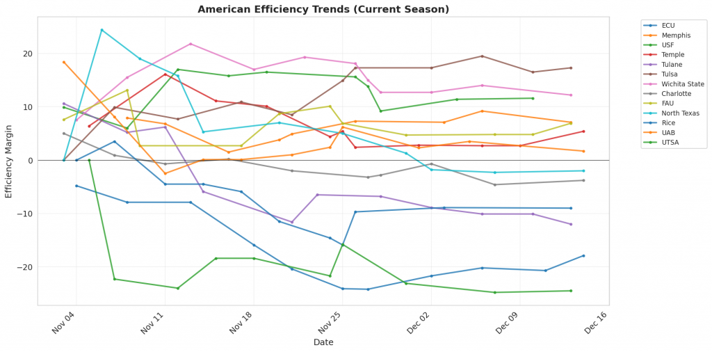 Figure 1: Efficiency margin trends for American teams throughout the season. Teams trending upward show improving performance, while downward trends indicate struggles.