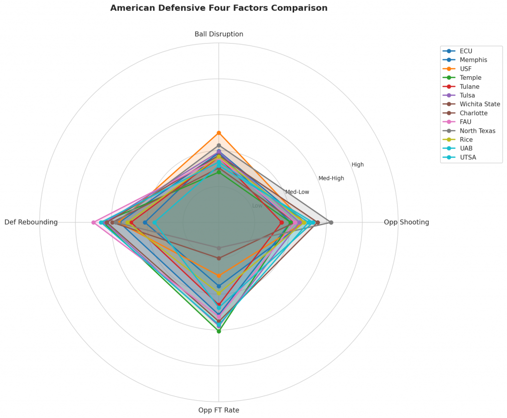 Figure 3: Defensive Four Factors comparison across American teams. The radar chart shows each team’s opponent shooting defense (Opp eFG%), ball disruption (forcing TOV%), defensive rebounding (DREB%), and opponent free throw prevention (Opp FT Rate).