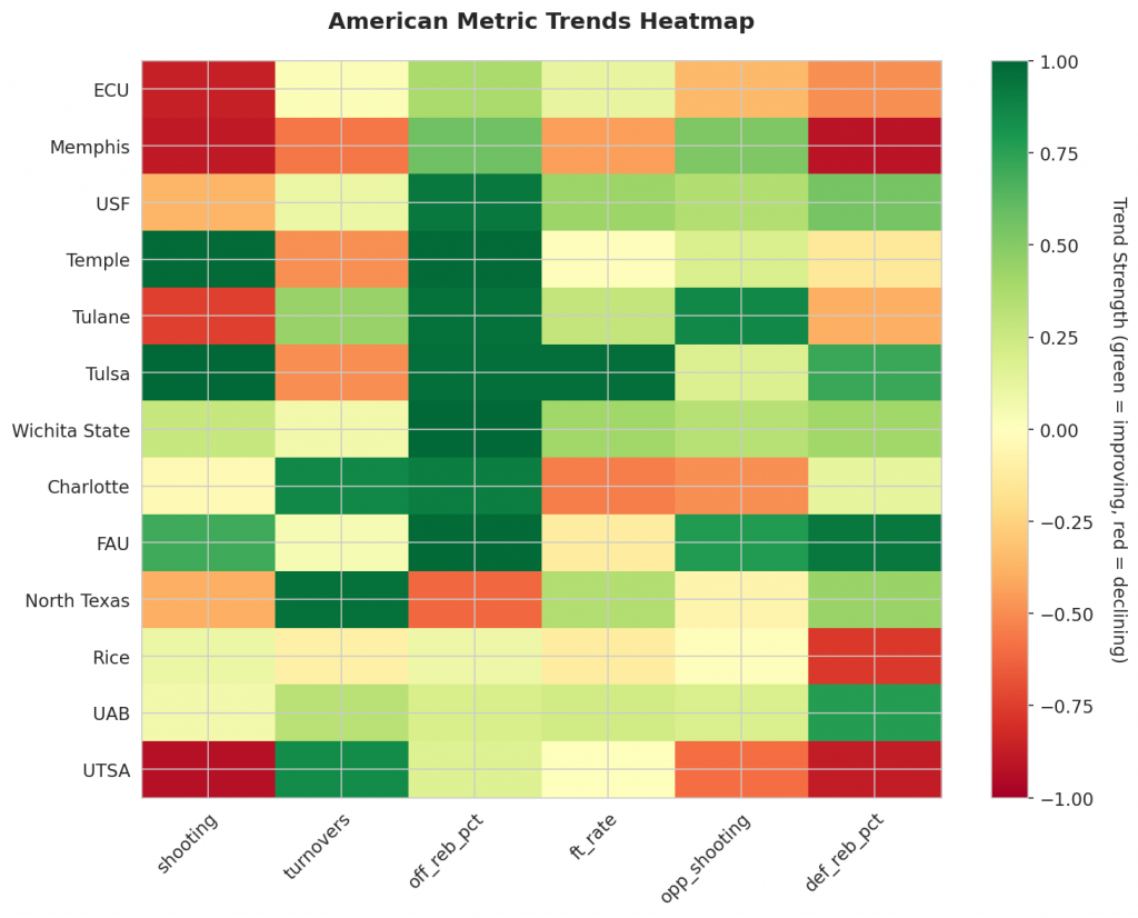 - Trending Down (Efficiency): ECU, Memphis, USF, Tulane, Charlotte