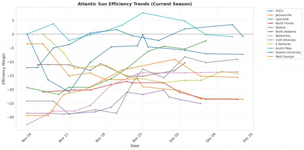 Figure 1: Efficiency margin trends for Atlantic Sun teams throughout the season. Teams trending upward show improving performance, while downward trends indicate struggles.