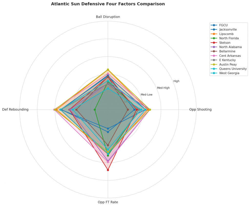 Figure 3: Defensive Four Factors comparison across Atlantic Sun teams. The radar chart shows each team’s opponent shooting defense (Opp eFG%), ball disruption (forcing TOV%), defensive rebounding (DREB%), and opponent free throw prevention (Opp FT Rate).
