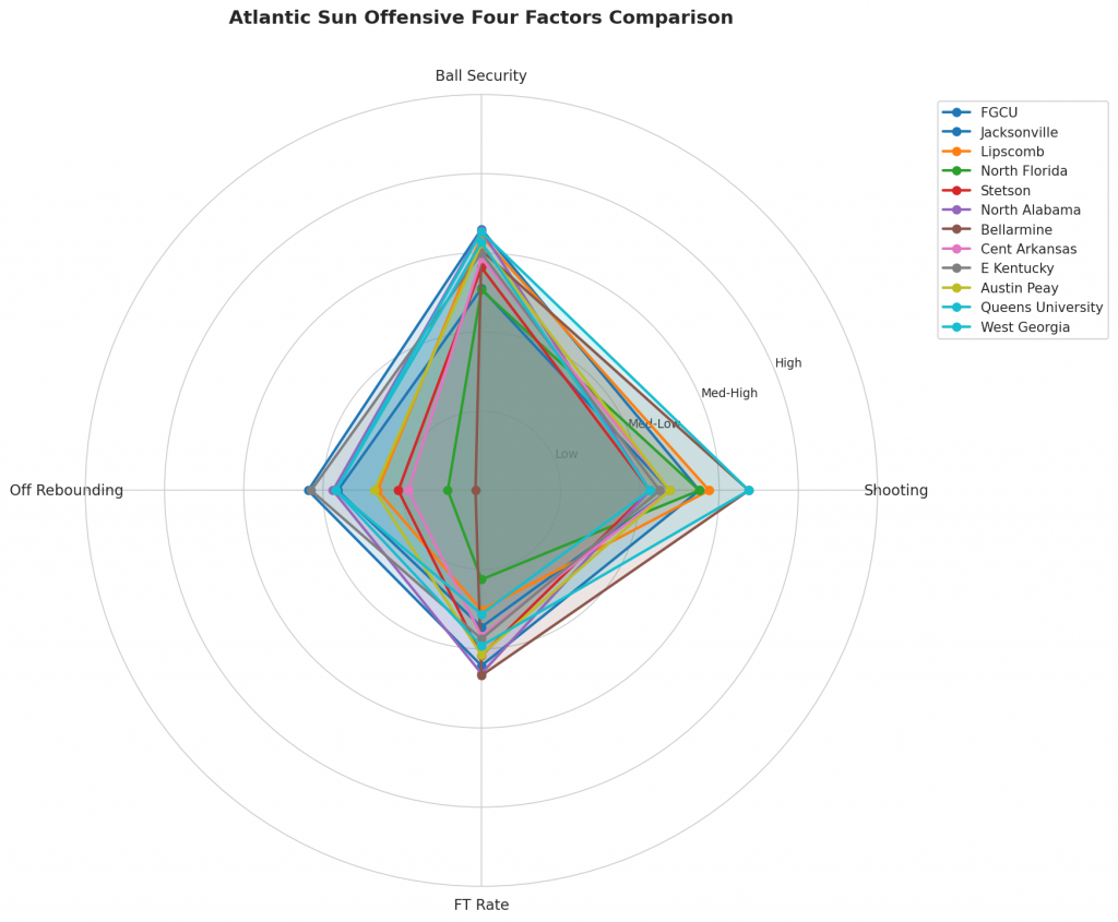 Figure 2: Offensive Four Factors comparison across Atlantic Sun teams. The radar chart shows each team’s shooting efficiency (eFG%), ball security (TOV%), offensive rebounding (OREB%), and free throw generation (FT Rate).