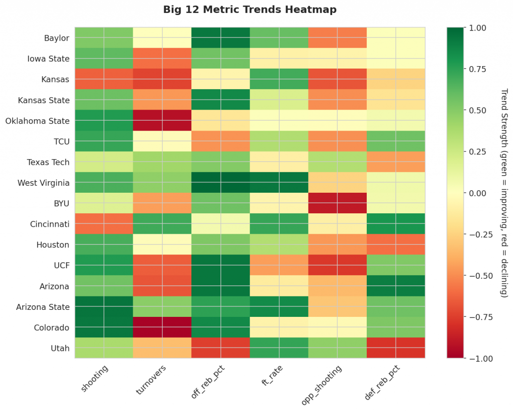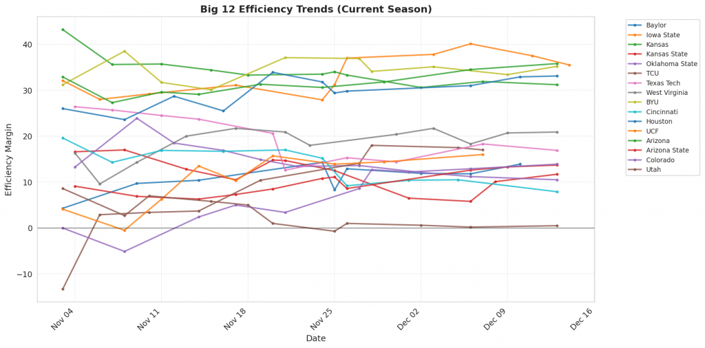 Figure 1: Efficiency margin trends for Big 12 teams throughout the season. Teams trending upward show improving performance, while downward trends indicate struggles.