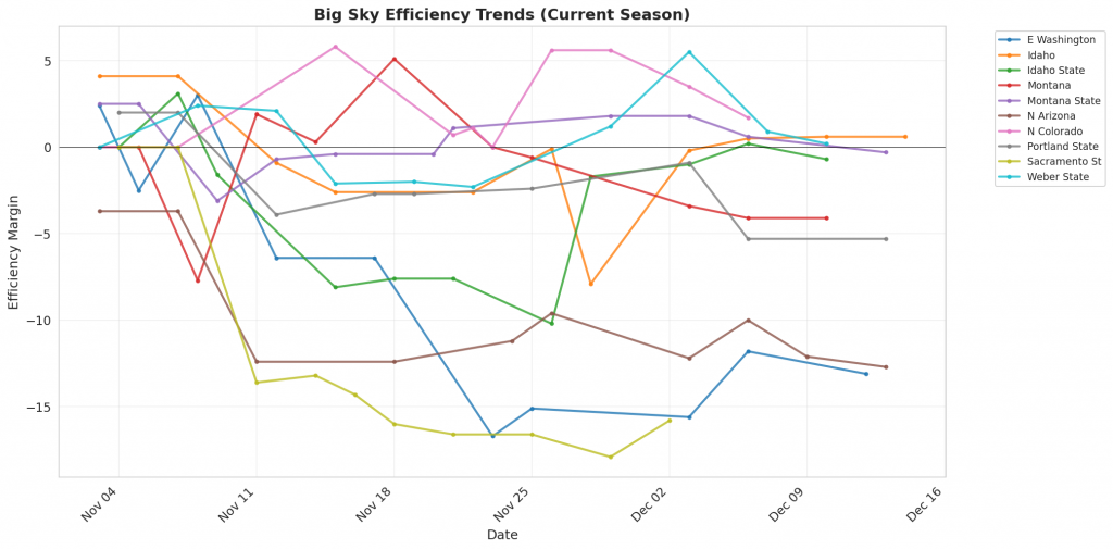 Figure 1: Efficiency margin trends for Big Sky teams throughout the season. Teams trending upward show improving performance, while downward trends indicate struggles.