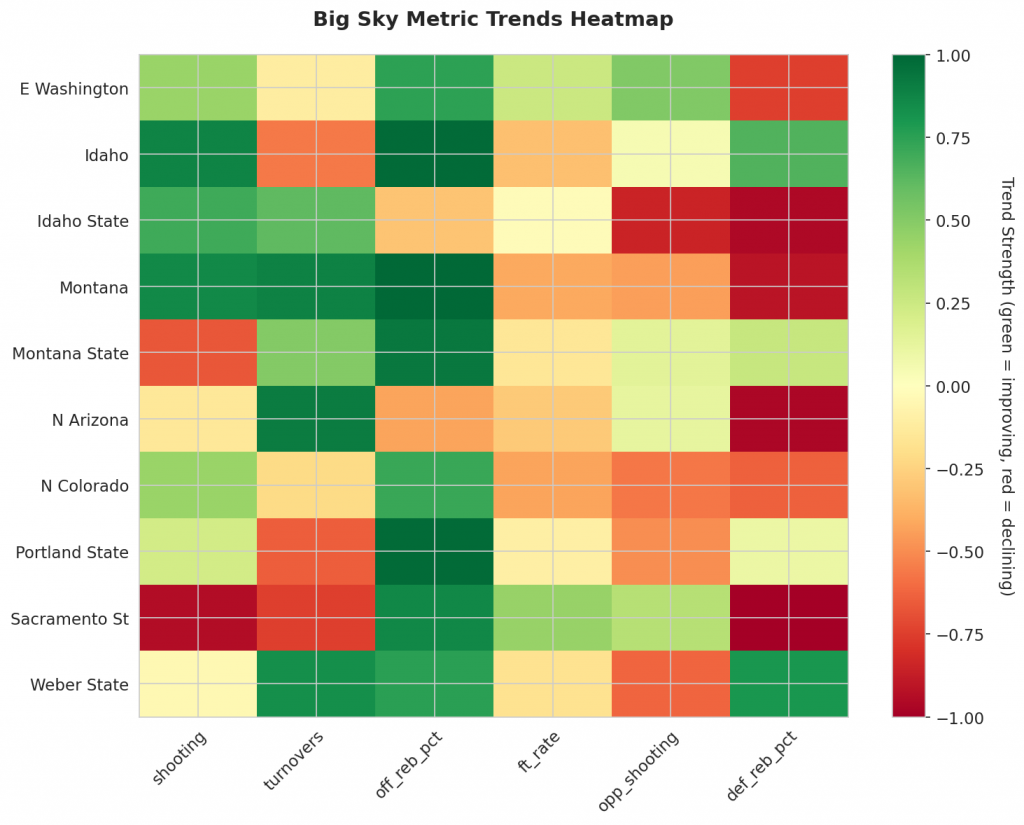 - Trending Down (Efficiency): Montana State, N Arizona, Sacramento St, Weber State
