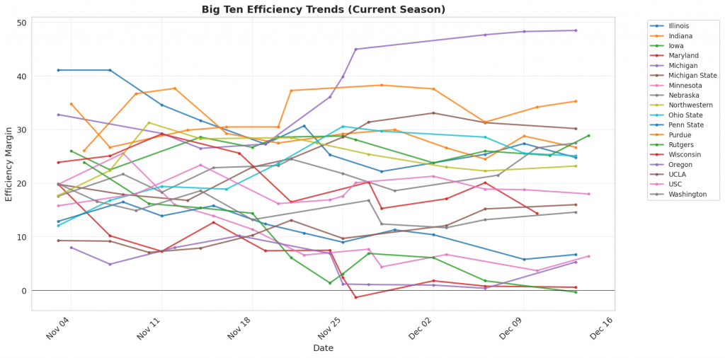 Figure 1: Efficiency margin trends for Big Ten teams throughout the season. Teams trending upward show improving performance, while downward trends indicate struggles.