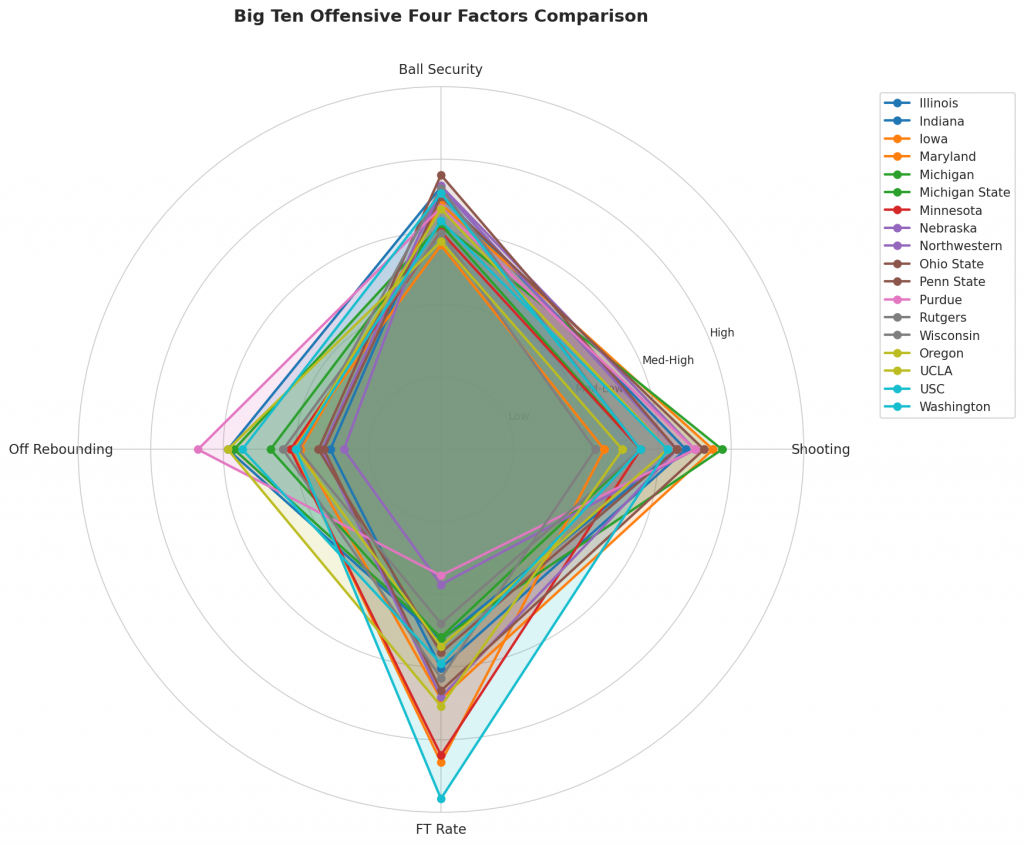 Figure 2: Offensive Four Factors comparison across Big Ten teams. The radar chart shows each team’s shooting efficiency (eFG%), ball security (TOV%), offensive rebounding (OREB%), and free throw generation (FT Rate).