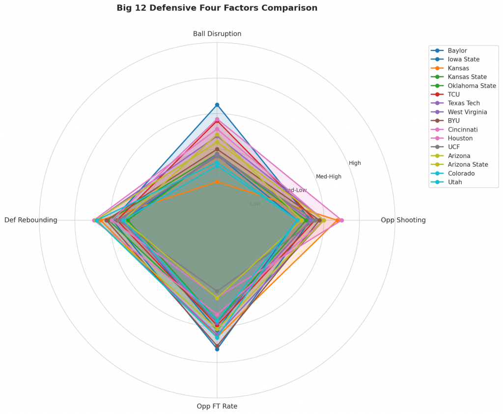 Figure 3: Defensive Four Factors comparison across Big Ten teams. The radar chart shows each team’s opponent shooting defense (Opp eFG%), ball disruption (forcing TOV%), defensive rebounding (DREB%), and opponent free throw prevention (Opp FT Rate).
