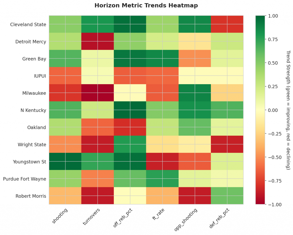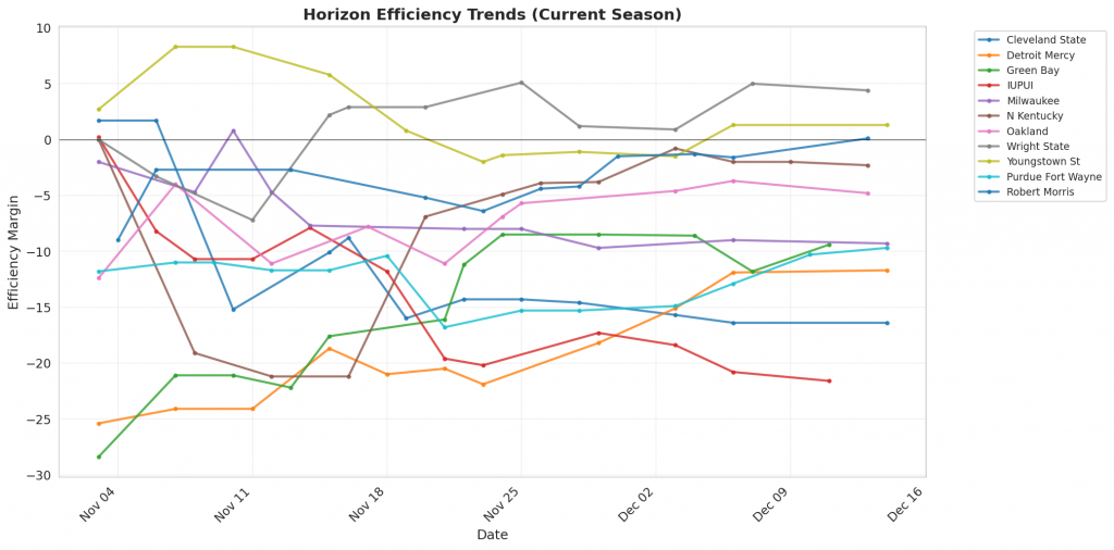Figure 1: Efficiency margin trends for Horizon teams throughout the season. Teams trending upward show improving performance, while downward trends indicate struggles.