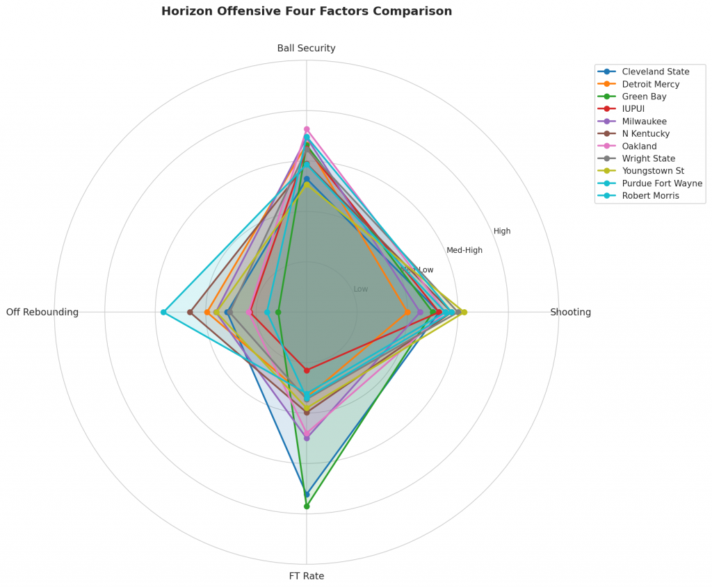 Figure 2: Offensive Four Factors comparison across Horizon teams. The radar chart shows each team’s shooting efficiency (eFG%), ball security (TOV%), offensive rebounding (OREB%), and free throw generation (FT Rate).