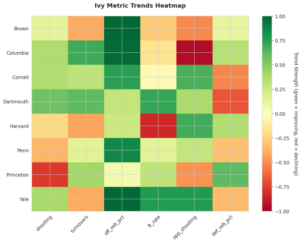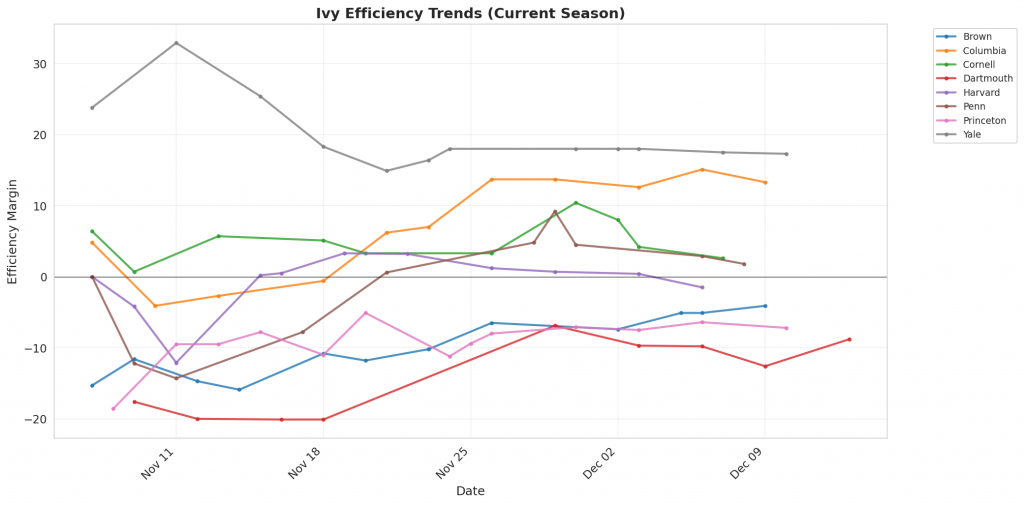 Figure 1: Efficiency margin trends for Ivy teams throughout the season. Teams trending upward show improving performance, while downward trends indicate struggles.