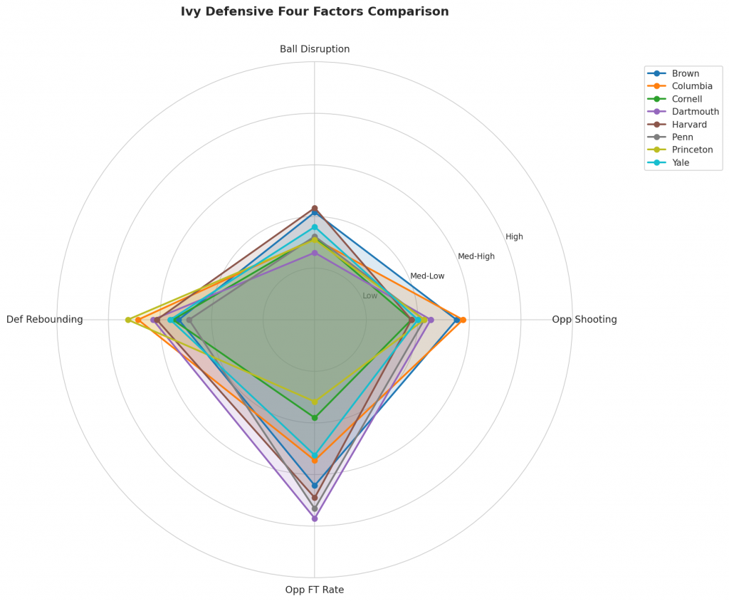 Figure 3: Defensive Four Factors comparison across Ivy teams. The radar chart shows each team’s opponent shooting defense (Opp eFG%), ball disruption (forcing TOV%), defensive rebounding (DREB%), and opponent free throw prevention (Opp FT Rate).