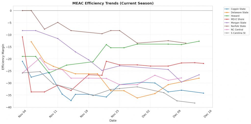 Figure 1: Efficiency margin trends for MEAC teams throughout the season. Teams trending upward show improving performance, while downward trends indicate struggles.
