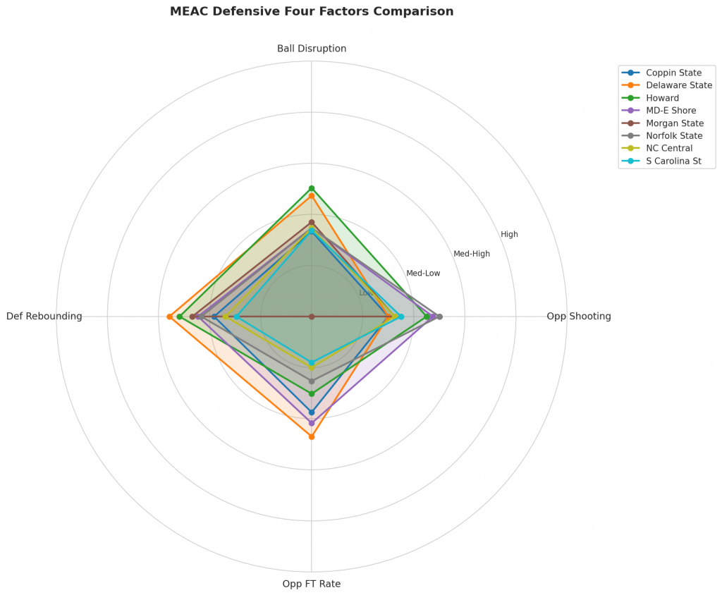 Figure 3: Defensive Four Factors comparison across MEAC teams. The radar chart shows each team’s opponent shooting defense (Opp eFG%), ball disruption (forcing TOV%), defensive rebounding (DREB%), and opponent free throw prevention (Opp FT Rate).