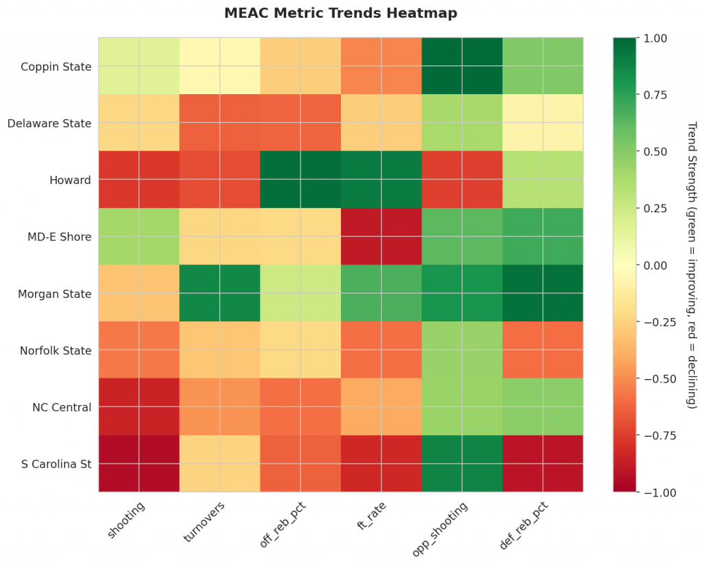 - Trending Down (Efficiency): Delaware State, Howard, Morgan State, Norfolk State, NC Central