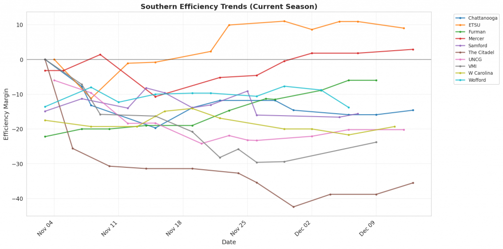 Figure 1: Efficiency margin trends for Southern teams throughout the season. Teams trending upward show improving performance, while downward trends indicate struggles.