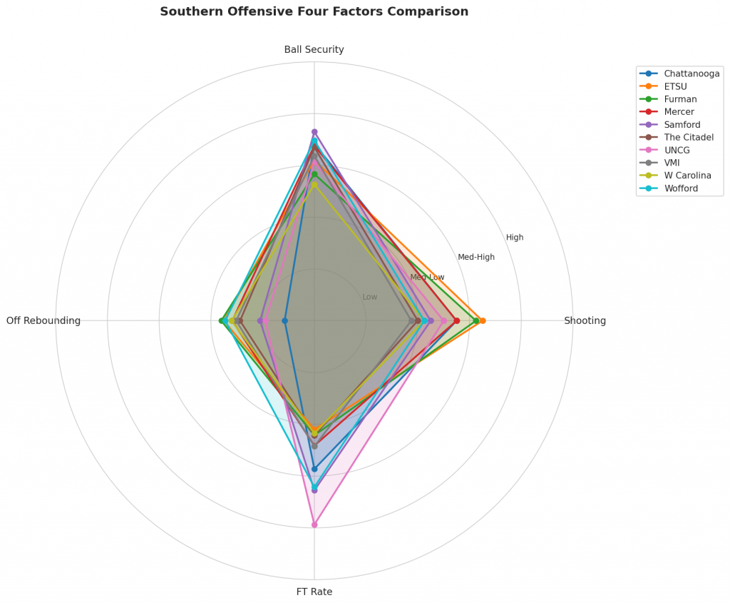 Figure 2: Offensive Four Factors comparison across Southern teams. The radar chart shows each team’s shooting efficiency (eFG%), ball security (TOV%), offensive rebounding (OREB%), and free throw generation (FT Rate).
