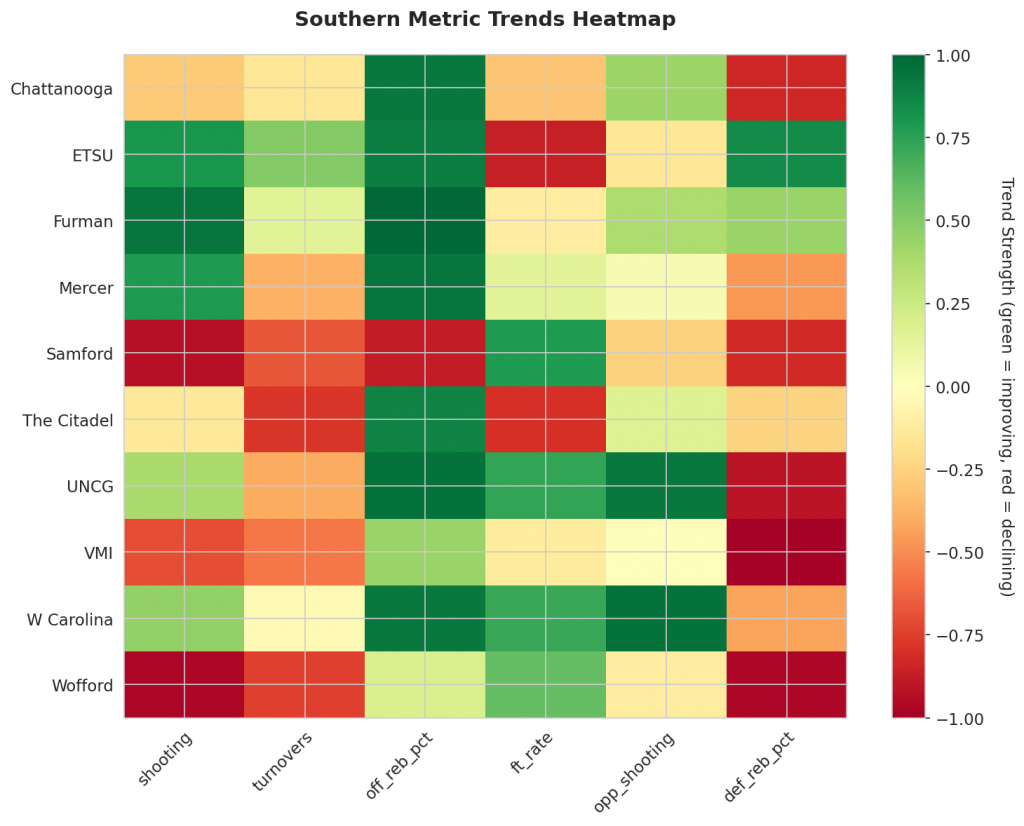 - Trending Down (Efficiency): Chattanooga, Samford, The Citadel, VMI, Wofford
