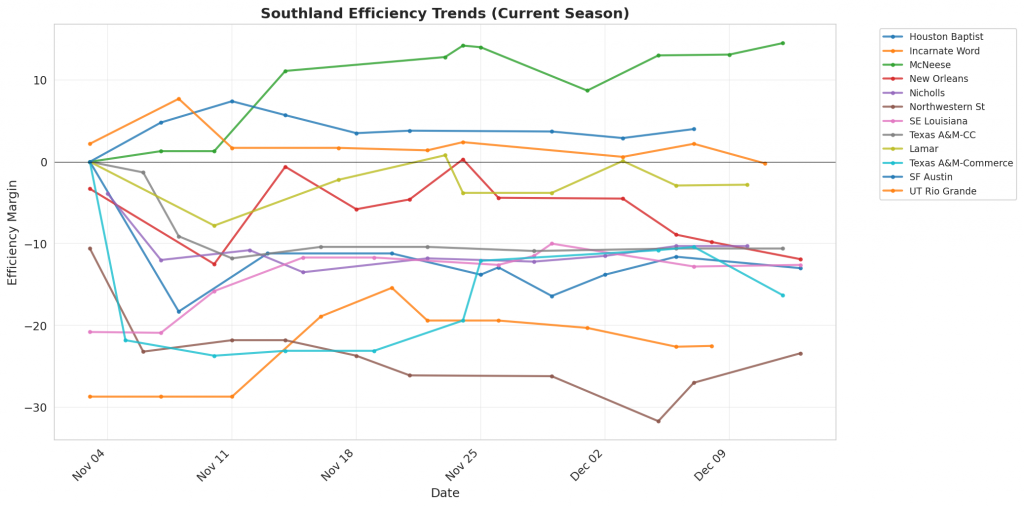 Figure 1: Efficiency margin trends for Southland teams throughout the season. Teams trending upward show improving performance, while downward trends indicate struggles.