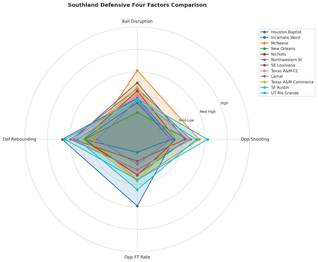 Figure 3: Defensive Four Factors comparison across Southland teams. The radar chart shows each team’s opponent shooting defense (Opp eFG%), ball disruption (forcing TOV%), defensive rebounding (DREB%), and opponent free throw prevention (Opp FT Rate).