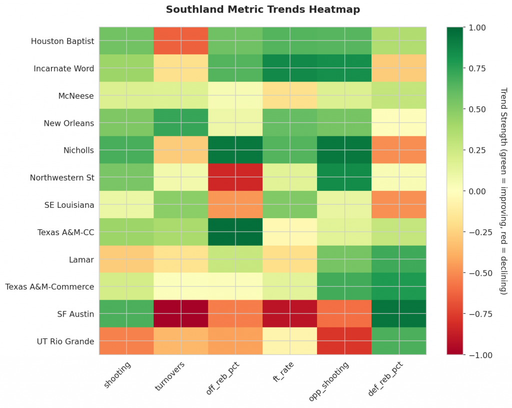 - Trending Up (Efficiency): Houston Baptist, Incarnate Word, McNeese, New Orleans, Nicholls