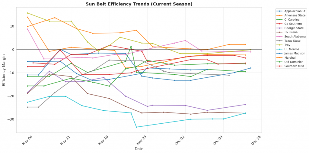 Figure 1: Efficiency margin trends for Sun Belt teams throughout the season. Teams trending upward show improving performance, while downward trends indicate struggles.