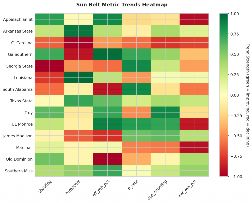 - Trending Down (Efficiency): C. Carolina, Georgia State, Louisiana, South Alabama, Texas State