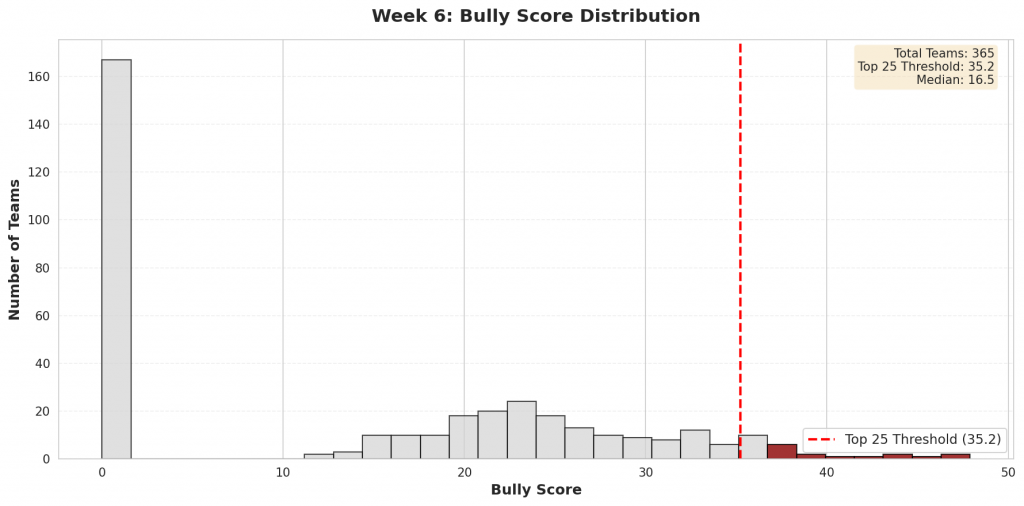 Figure 4: Distribution of bully scores across all Division I teams. The top 25 bullies (highlighted in red) represent teams whose efficiency metrics are most inflated by their performance patterns.