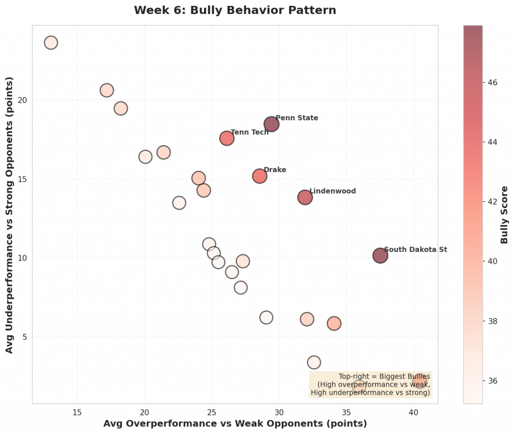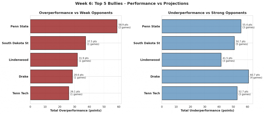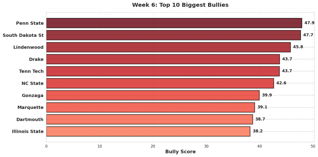 Figure 1: Top 10 teams with the highest bully scores in Week 6. Bully scores reflect the combination of overperformance against weak opponents and underperformance against quality competition.