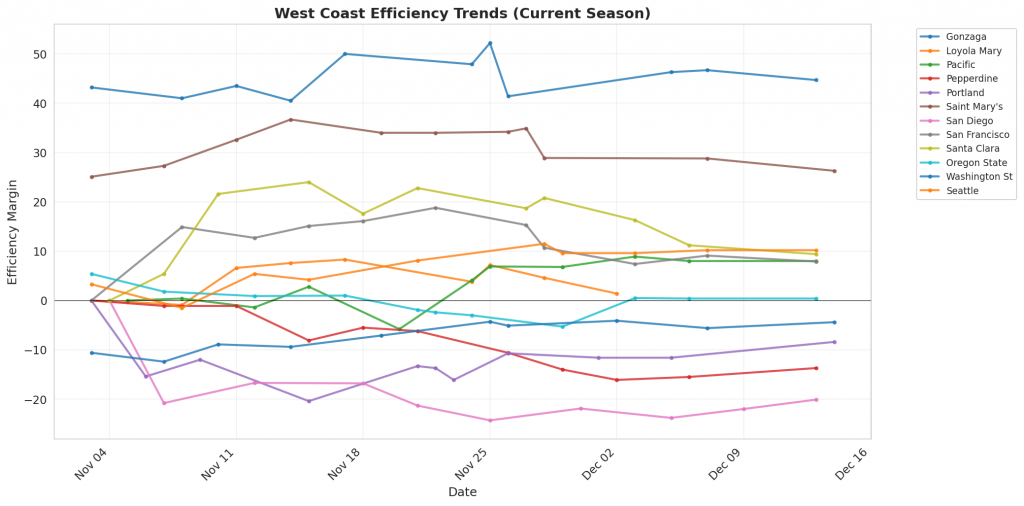 Figure 1: Efficiency margin trends for West Coast teams throughout the season. Teams trending upward show improving performance, while downward trends indicate struggles.