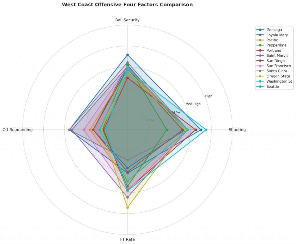 Figure 2: Offensive Four Factors comparison across West Coast teams. The radar chart shows each team’s shooting efficiency (eFG%), ball security (TOV%), offensive rebounding (OREB%), and free throw generation (FT Rate).