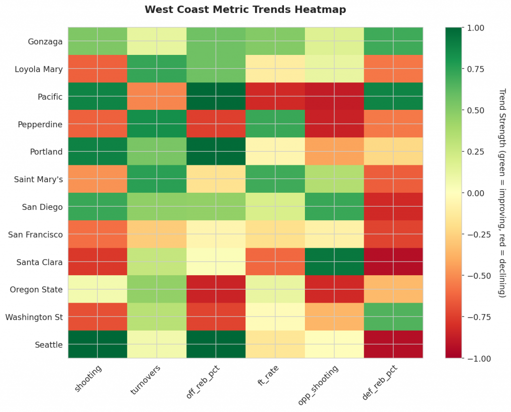 - Trending Up (Efficiency): Gonzaga, Pacific, Portland, San Diego, Oregon State