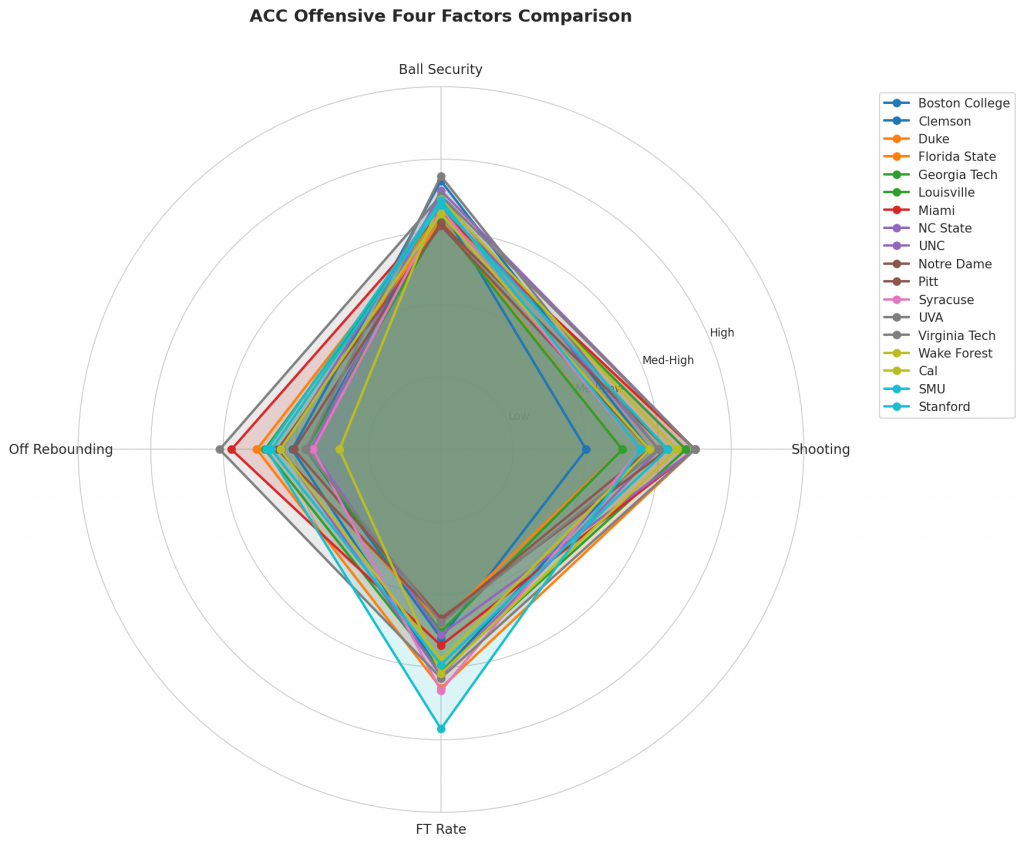 Figure 2: Offensive Four Factors comparison across ACC teams. The radar chart shows each team’s shooting efficiency (eFG%), ball security (TOV%), offensive rebounding (OREB%), and free throw generation (FT Rate).