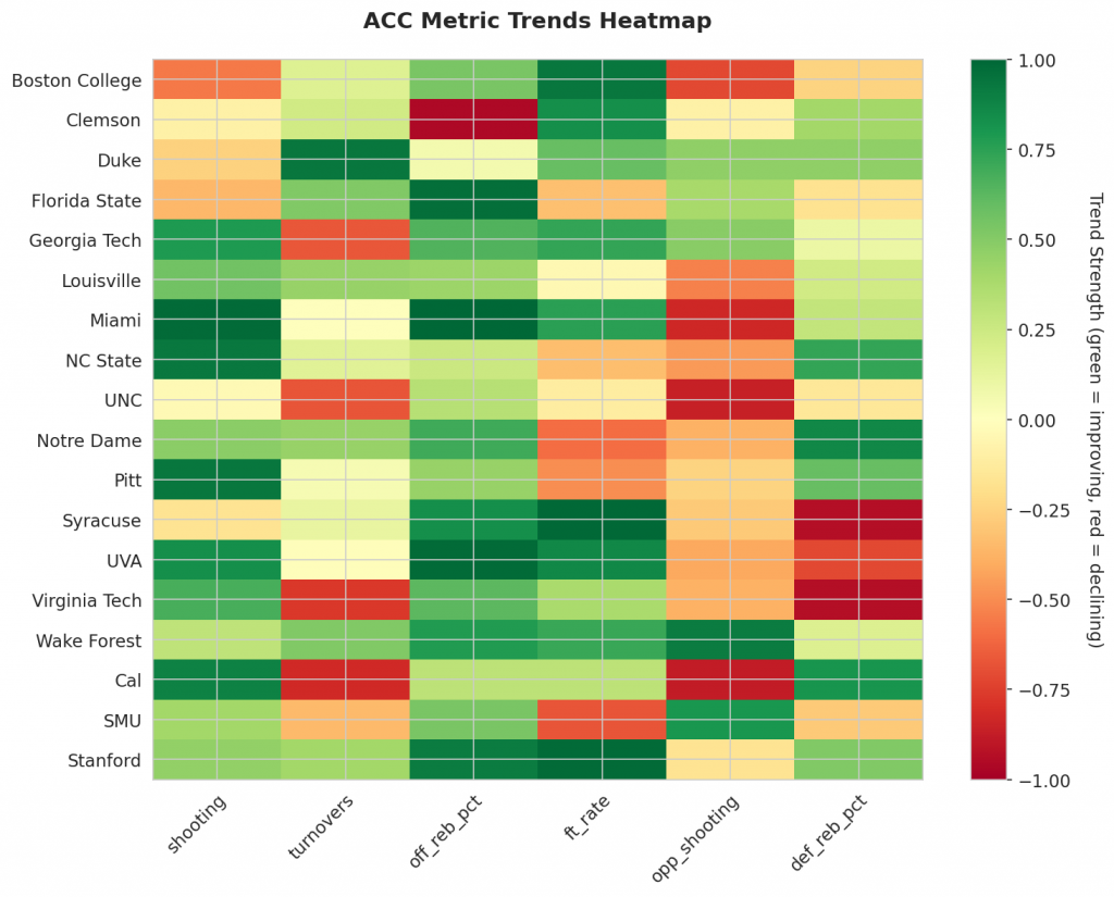 - Trending Down (Efficiency): Boston College, Clemson, Duke, Florida State, UNC