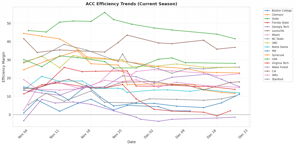 Figure 1: Efficiency margin trends for ACC teams throughout the season. Teams trending upward show improving performance, while downward trends indicate struggles.