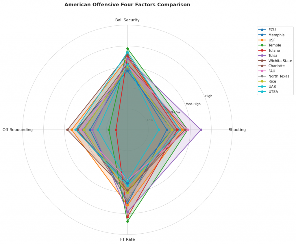 Figure 2: Offensive Four Factors comparison across American teams. The radar chart shows each team’s shooting efficiency (eFG%), ball security (TOV%), offensive rebounding (OREB%), and free throw generation (FT Rate).