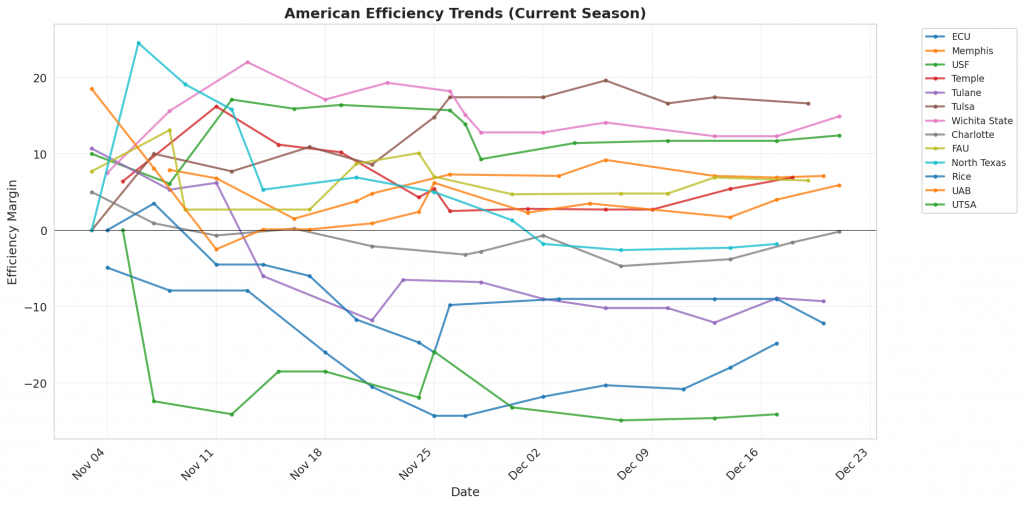 Figure 1: Efficiency margin trends for American teams throughout the season. Teams trending upward show improving performance, while downward trends indicate struggles.