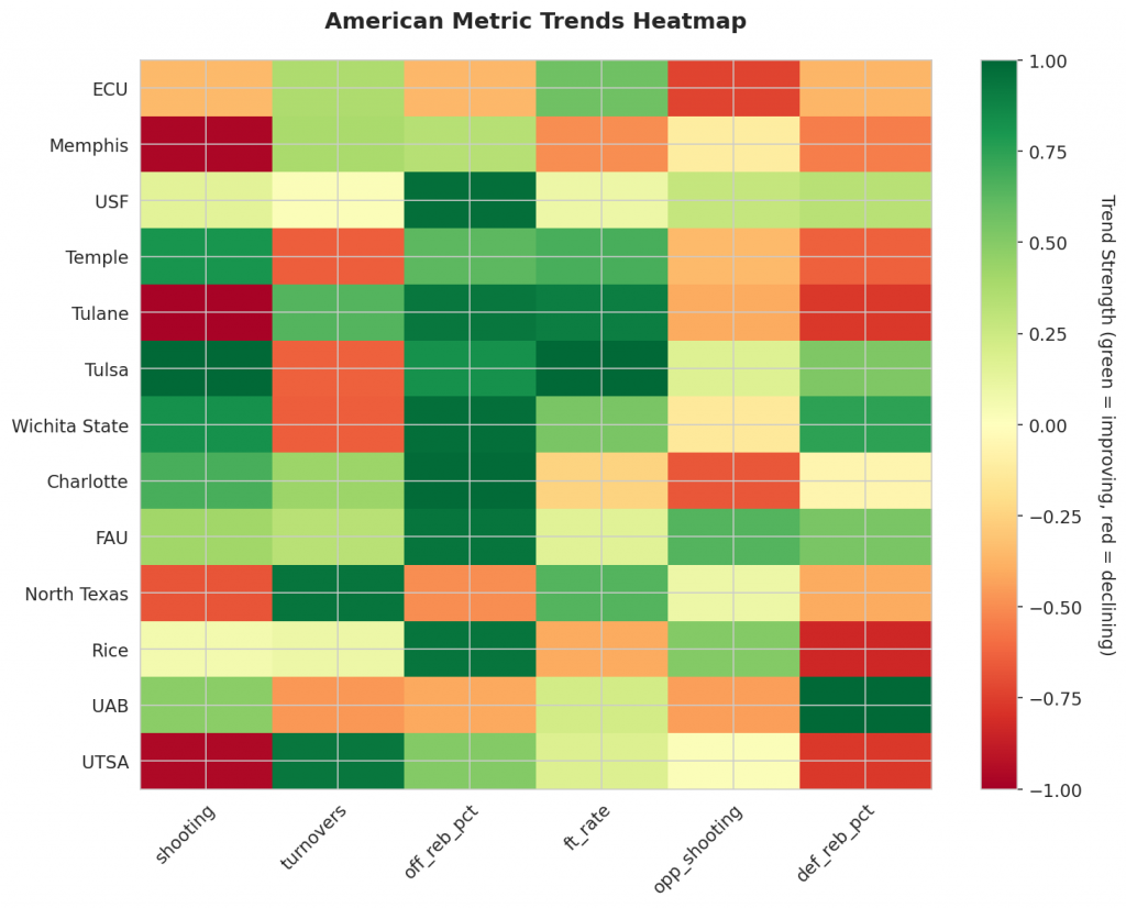 - Trending Down (Efficiency): ECU, Memphis, Tulane, North Texas, UTSA