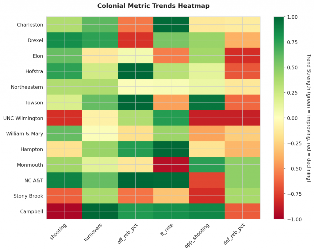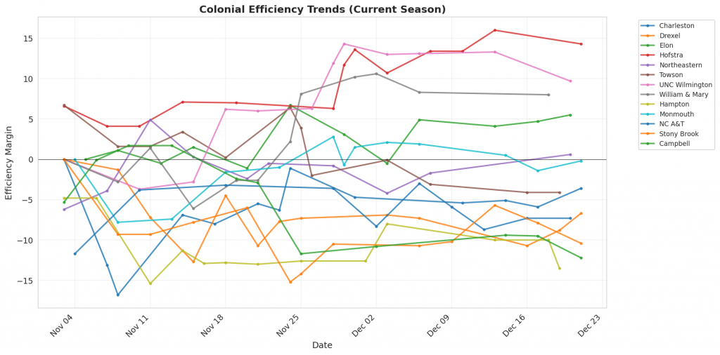 Figure 1: Efficiency margin trends for Colonial teams throughout the season. Teams trending upward show improving performance, while downward trends indicate struggles.