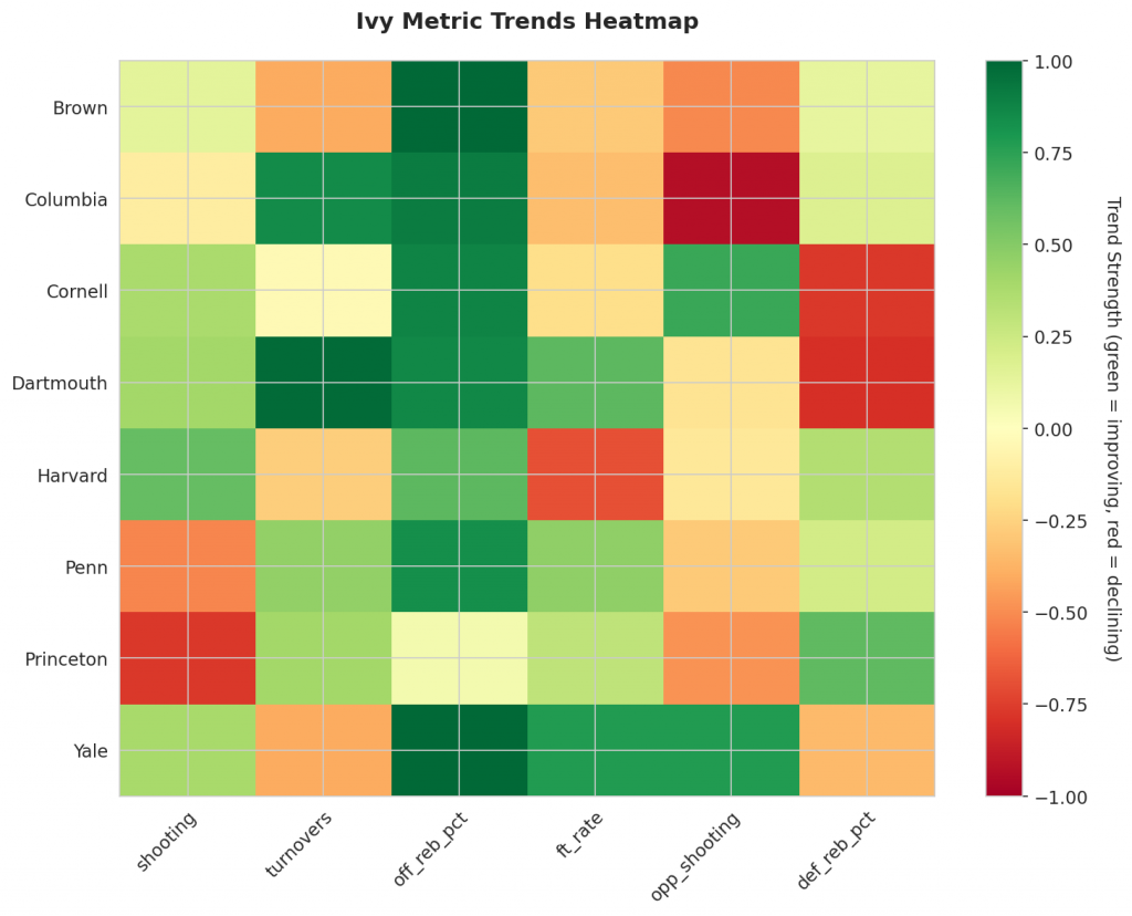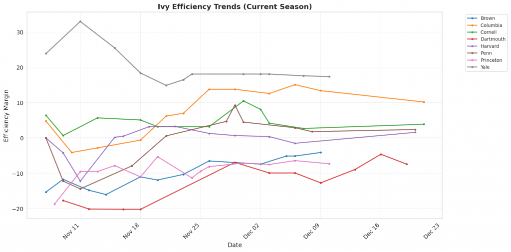Figure 1: Efficiency margin trends for Ivy teams throughout the season. Teams trending upward show improving performance, while downward trends indicate struggles.