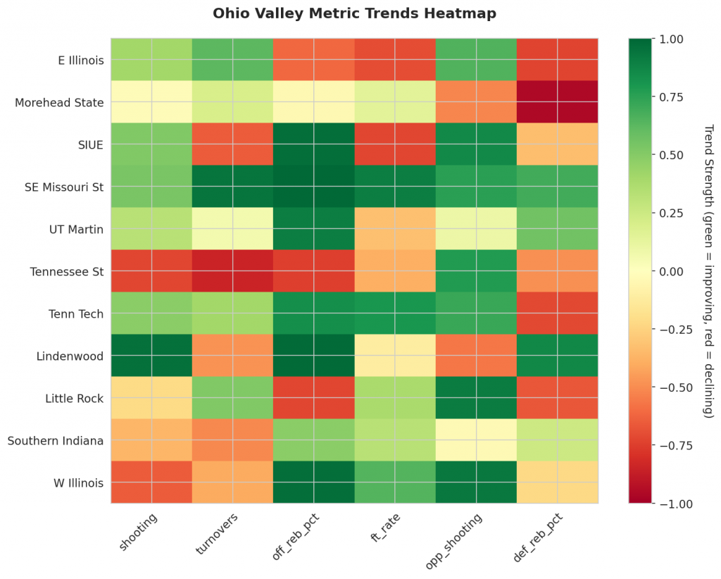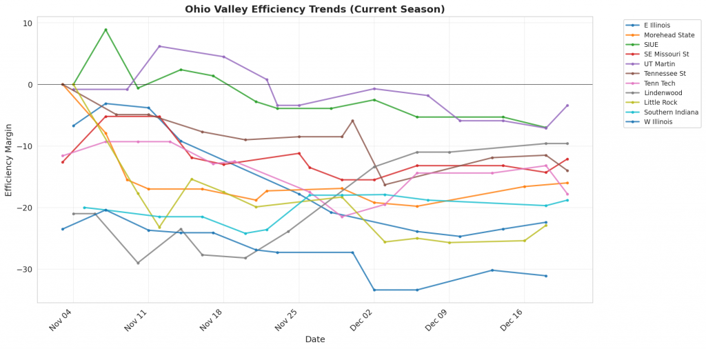 Figure 1: Efficiency margin trends for Ohio Valley teams throughout the season. Teams trending upward show improving performance, while downward trends indicate struggles.