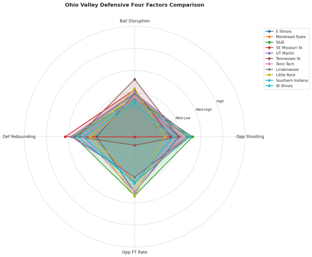 Figure 3: Defensive Four Factors comparison across Ohio Valley teams. The radar chart shows each team’s opponent shooting defense (Opp eFG%), ball disruption (forcing TOV%), defensive rebounding (DREB%), and opponent free throw prevention (Opp FT Rate).