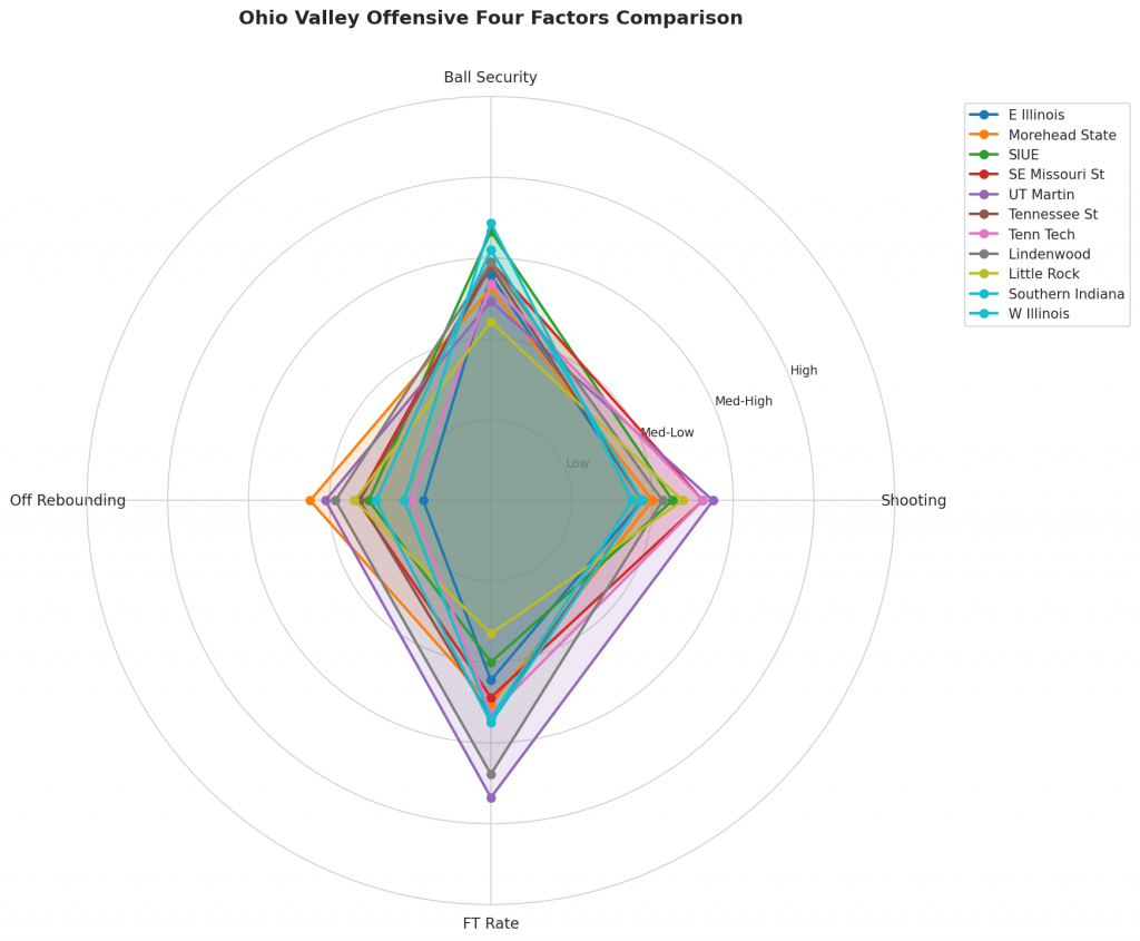 Figure 2: Offensive Four Factors comparison across Ohio Valley teams. The radar chart shows each team’s shooting efficiency (eFG%), ball security (TOV%), offensive rebounding (OREB%), and free throw generation (FT Rate).