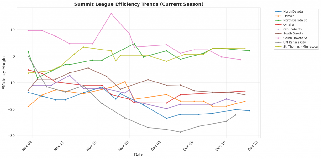 Figure 1: Efficiency margin trends for Summit League teams throughout the season. Teams trending upward show improving performance, while downward trends indicate struggles.