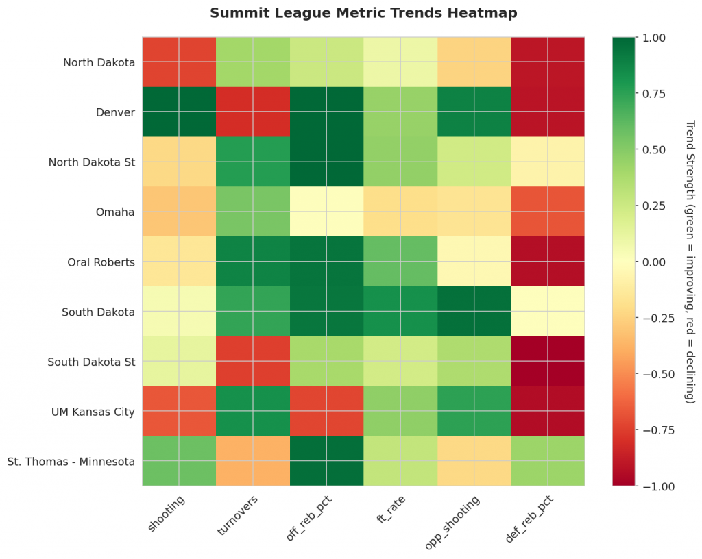As Summit League teams continue their season, the MACD trending indicators will help identify which teams are genuinely improving versus those riding unsustainable momentum. Check back next week for updated analysis.