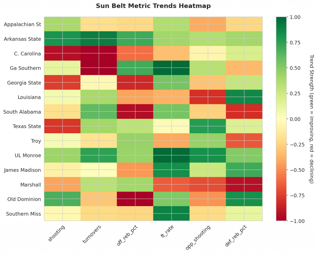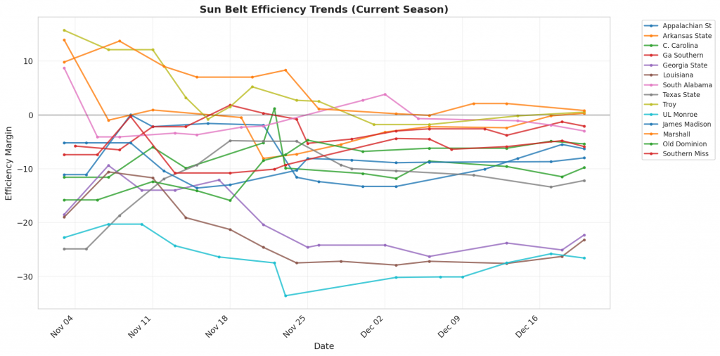 Figure 1: Efficiency margin trends for Sun Belt teams throughout the season. Teams trending upward show improving performance, while downward trends indicate struggles.